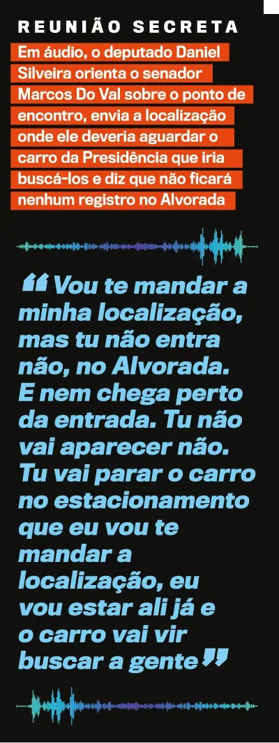 A preparação para a reunião foi cercada de cuidados absolutamente incomuns. Por sugestão de Daniel Silveira, ficou combinado que ele e o senador se refeririam ao encontro apenas por códigos. No dia marcado, o deputado passou uma mensagem de áudio a Marcos do Val para instruí-lo sobre como chegar ao destino, de maneira discreta, sem serem vistos: “Vou te mandar a minha localização, mas tu não entra não, no Alvorada. E nem chega perto da entrada. Tu não vai aparecer. Tu vai parar o carro no estacionamento que eu vou te mandar a localização. Eu vou estar ali. O carro vai vir buscar a gente”. E assim foi. Por volta das 17h30 do dia 9, Marcos do Val seguiu com seu motorista até a localização enviada pelo deputado por GPS – um via que dá acesso ao Palácio do Alvorada, próxima ao Palácio do Jaburu, a residência oficial do vice-presidente. Lá, distante de olhos curiosos, os dois embarcaram num carro da segurança do presidente da República até o Alvorada, que fica alguns metros à frente, onde entraram sem deixar qualquer registro na portaria.