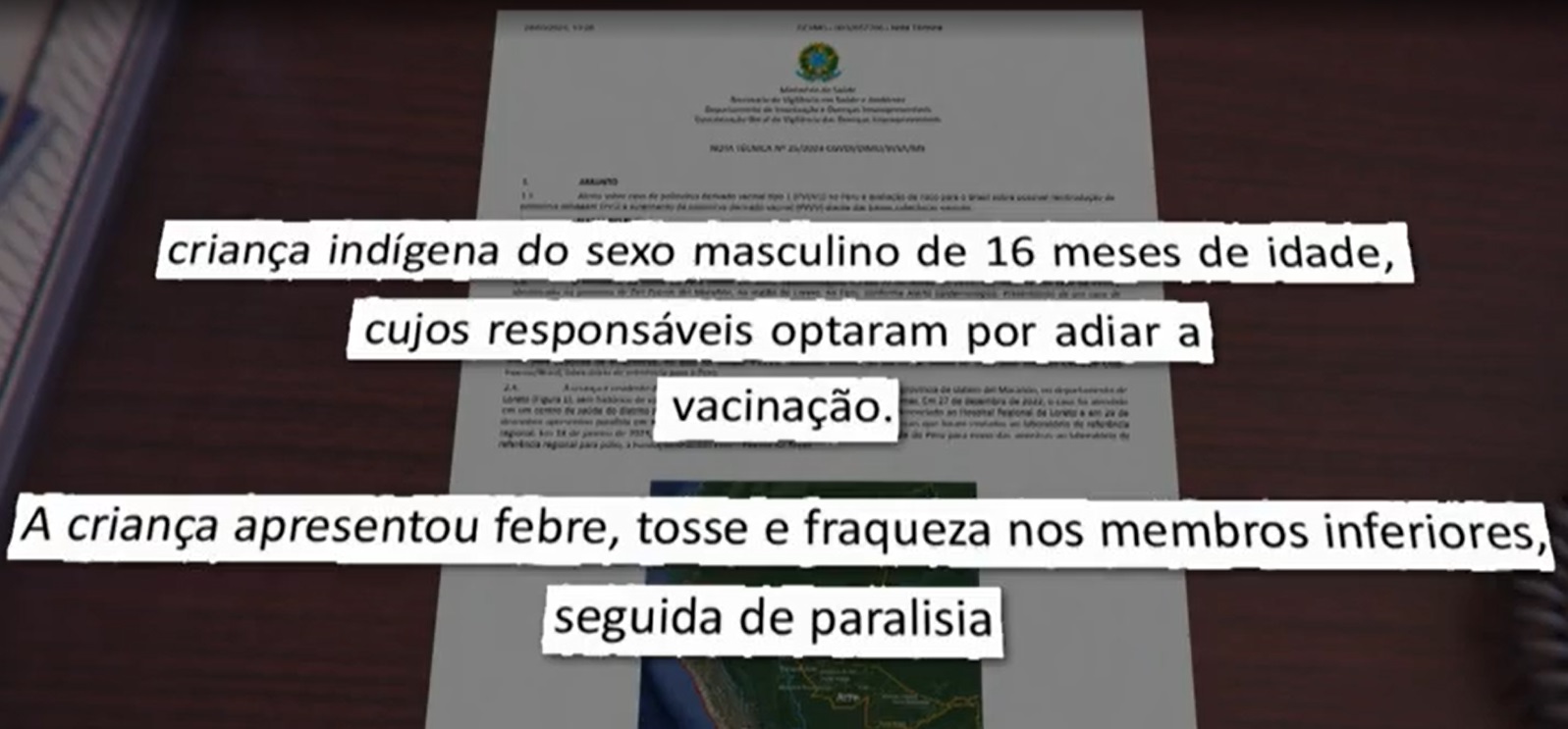 A nota técnica do Ministério da Saúde esclarece que, a confirmação foi em 22 de março, depois de análises feitas no Brasil pela Fiocruz. É uma criança indígena de um ano e quatro meses que, segundo o governo peruano, os responsáveis optaram por adiar a vacinação.