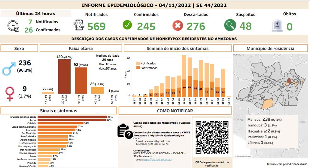 Com isso, o atual cenário da varíola dos macacos no Amazonas é de 569 notificações, 245 confirmados, 276 descartados, 48 suspeitos e nenhum registro de óbito pela doença.