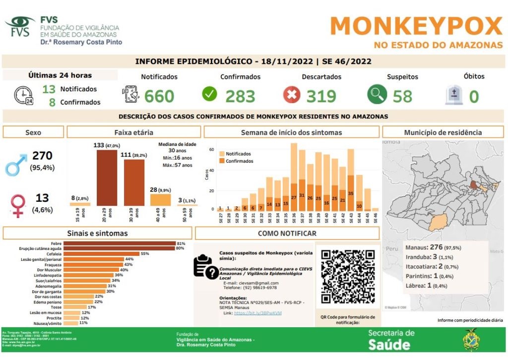 Com isso, o atual cenário da varíola dos macacos no Amazonas é de 283 casos confirmados; 319 casos descartados e 58 casos suspeitos estão aguardando o resultado de exames.