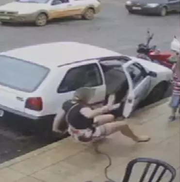 Em um registro feito pelas câmeras de segurança, a mulher desce do carro ao lado da sua filha e vai até o supermercado. Na volta para o veículo, o homem joga um objeto no automóvel e ela se direciona até o rapaz para questioná-lo, mas começa a ser agredida.