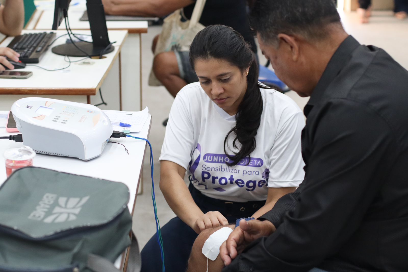 Grávida de oito meses do quarto filho, Cleonice adquiriu diabetes e precisa fazer monitoramento da glicose continuamente. Ela aproveitou a oferta do serviço para conferir como estava o índice glicêmico.“Eu vim acompanhada pelo meu esposo, porque eu vi que estava tendo essa ação hoje aqui. Aproveitei que tem esse daqui da saúde, para medir a glicose e conferir a pressão. E além disso nós usamos o serviço de RCN para o documento do meu filho”, contou a professora.