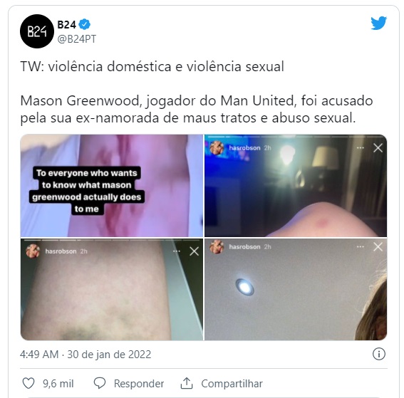 O jogador do Manchester United Mason Greenwood, de 20 anos, está sendo acusado pela namorada de violência doméstica. Harriet Robson divulgou na manhã deste domingo, em suas redes sociais, imagens fortes de escoriações pelo corpo e com a boca sangrando, além de um vídeo onde o atleta estaria tentado fazer com que ela tivesse relações sexuais com ele. A informação foi publicada inicialmente pela ESPN.