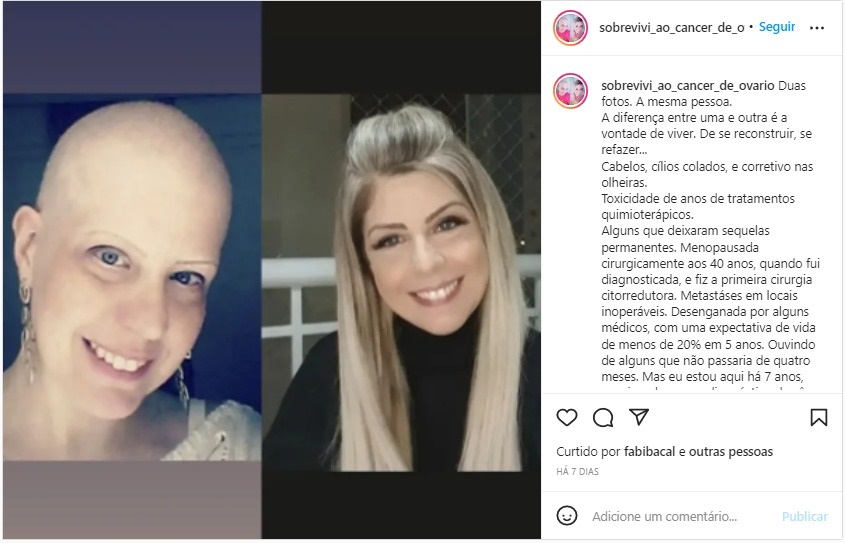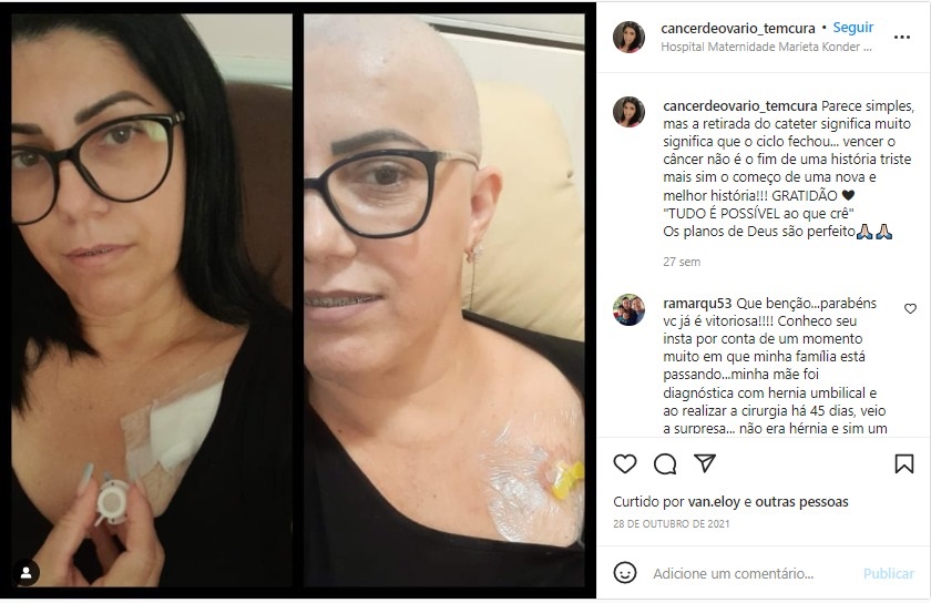 Já no perfil “Câncer de ovário tem cura“, Kátia Regina também divide a história e as experiências de um processo de remissão do câncer de ovário. No cotidiano, ela mostra os momentos de comemoração, como a retirada do cateter e até mesmo a data de estar um ano sem quimioterapia.