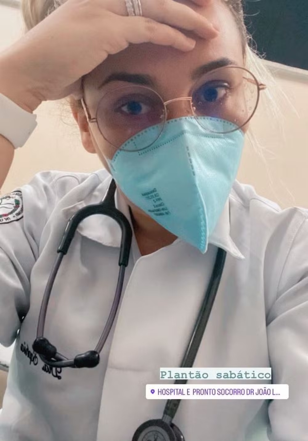 Em ambiente hospitalar, Sophia Livas simulava exaustão típica da rotina médica para reforçar