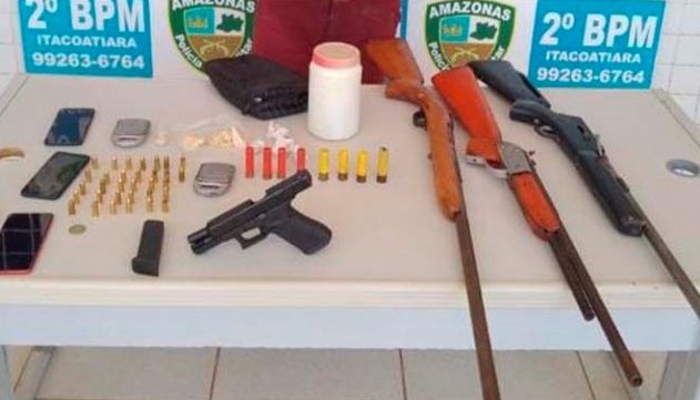 O suspeito foi preso em uma residência na rua Curió, bairro da Paz, onde foram apreendidas uma pistola calibre 9 milímetros, uma espingarda calibre 20 e uma espingarda calibre 28, além de 40 munições, uma balança de precisão e 100 gramas de oxi.