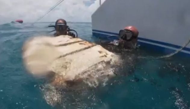 Os mergulhadores tiveram dificuldade para conseguir retirar o objeto do mar. Eles utilizaram roldanas e botes infláveis.