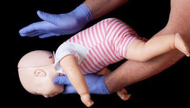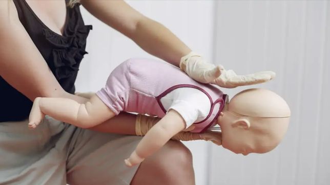 O bebê deve ser colocado de bruços sobre o antebraço, com a cabeça mais baixa que o corpo. Devem ser dadas cinco pancadas firmes entre as escápulas e, em seguida, o bebê deve ser virado de barriga para cima para receber cinco compressões torácicas com a base da palma da mão.Caso perca a consciência, deve-se iniciar a RCP, com 30 compressões torácicas e duas ventilações.