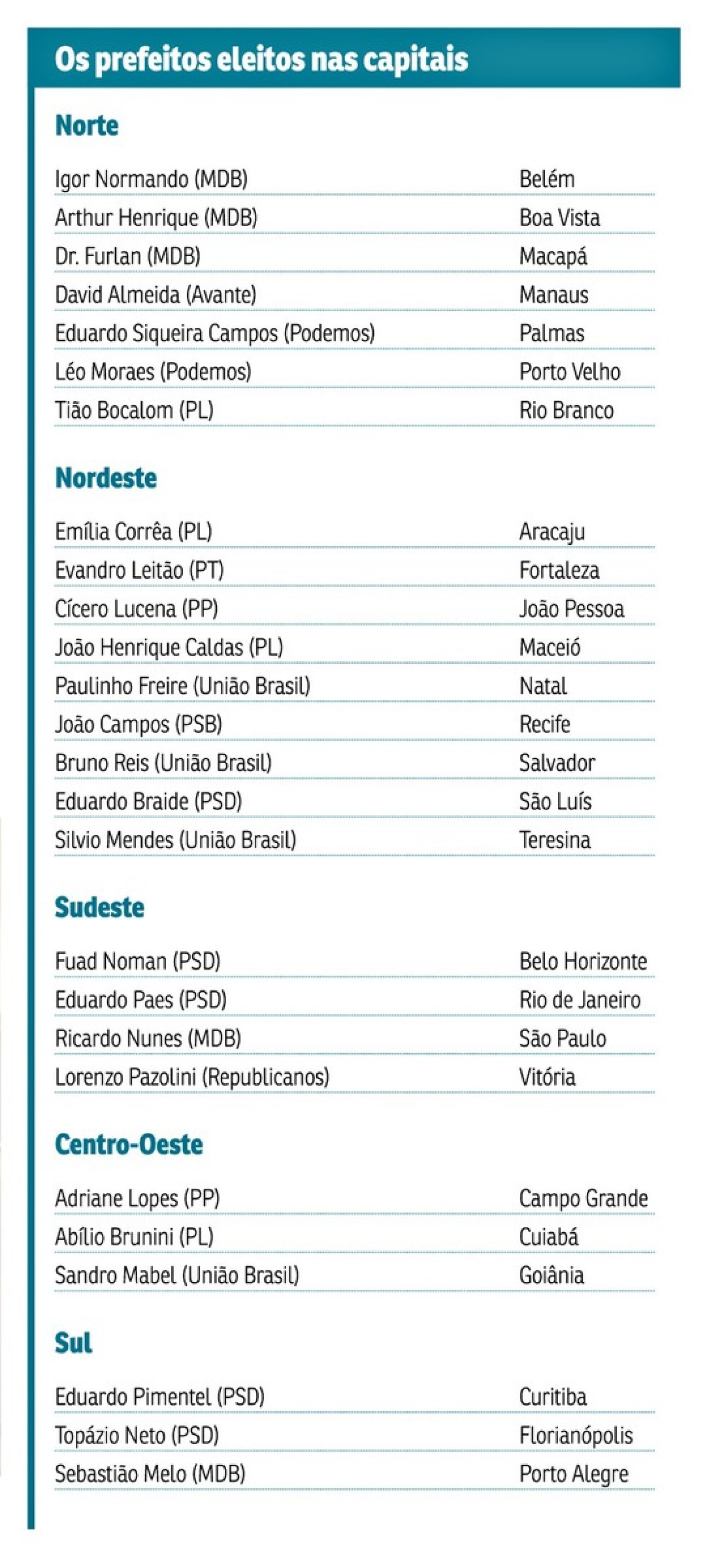 No Rio de Janeiro, a história foi outra. O favoritismo de Eduardo Paes (PSD) se confirmou ainda no primeiro turno. Ele se reelegeu com 60,47% (1,9 milhão) dos votos — o dobro do que teve o deputado Alexandre Ramagem (PL), apoiado por Bolsonaro.Paes, que foi chamado por Lula de "o melhor prefeito do país" na pré-campanha eleitoral do ano passado, iniciará, nesta quarta-feira, seu quarto mandato à frente da capital do estado fluminense.