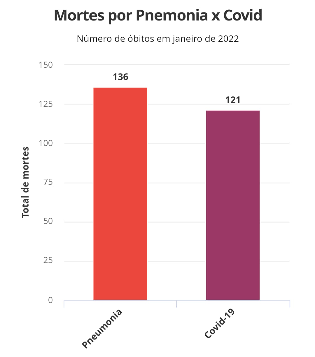 No primeiro mês de 2022 foram registrados 136 óbitos por pneumonia e 121 óbitos por Covid-19. O número de mortes por pneumonia foi 11% maior.