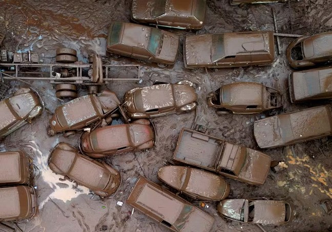 Imagem de drone de 3 de maio de 2024 mostra mar de carros enlameados