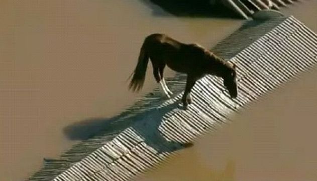 Em uma imagem que captura a essência da crise climática, um cavalo é visto em cima de um telhado, uma visão que desafia a lógica e as expectativas. Este não é um cenário de um conto de fadas ou de uma história distópica; é um retrato real das condições climáticas extremas que o Rio Grande do Sul e o mundo têm enfrentado.
