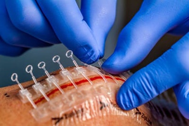 O dispositivo é composto por tiras adesivas médicas conectadas por pequenas travas ajustáveis que funcionam como um zíper sobre a pele. Ele é aplicado ao redor da incisão e fechado progressivamente, sem perfurações, mantendo o tecido alinhado de forma segura e uniforme. O resultado é um procedimento rápido, limpo e com menor risco de infecção, já que evita os múltiplos furos causados pelas suturas tradicionais.