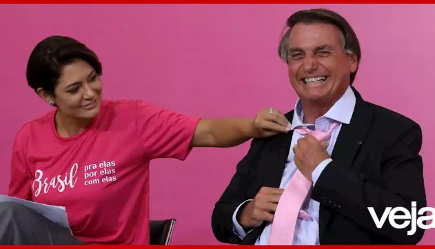 A primeira-dama Michelle Bolsonaro tenta arrumar gravata do presidente Jair Bolsonaro em evento do Dia Internacional da Mulher no Palácio do Planalto Clauber Cleber Caetano/PR.