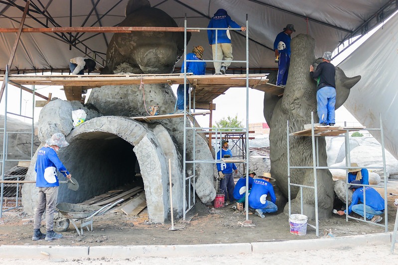 Entre ferros moldados e esculpidos, operários seguem executando os cenários com vários níveis de conclusão e acabamento. A construção terá cenários interativos temáticos, com rampas de escalada, escorregadores, área molhada, entre outros. Todas as figuras ligadas à floresta serão manuseadas como brinquedos lúdicos para as crianças e interativos para os adultos.