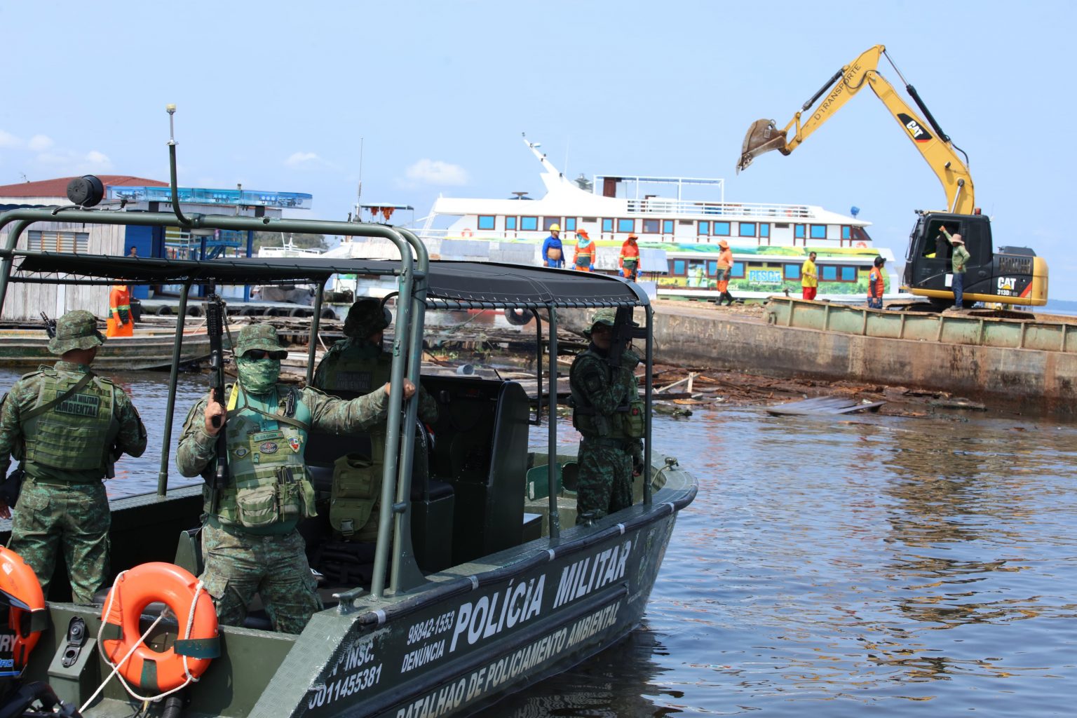 O suporte do governo do Amazonas na operação é dado pela PMAM, por meio do Batalhão Ambiental.“A missão da Polícia Militar, por meio do Batalhão Ambiental, é fazer a segurança, o patrulhamento fluvial, para evitar que aconteça alguma ocorrência policial. Nós montamos duas lanchas, uma de transporte de tropa que vai atuar com a tropa do Choque e da Rocam, e nós temos uma lancha de patrulhamento fluvial que a nossa equipe geralmente monta com seis policiais que vai ficar patrulhando o entorno da operação”, informou o major Victor Melo, comandante do Batalhão Ambiental.