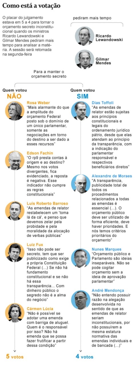 Antes de o julgamento ser suspenso, quatro ministros haviam seguido o voto da ministra Rosa Weber, relatora do caso, para tornar o orçamento secreto inconstitucional: Cármen Lúcia, Luiz Fux, Edson Fachin e Luís Roberto Barroso. Outros quatro — André Mendonça, Kássio Nunes Marques, Alexandre de Moraes e Dias Toffoli — admitiram que elas possam continuar existindo, mas com uma série de ressalvas que torne os pagamentos mais transparentes e com critérios mais rígidos de controle.