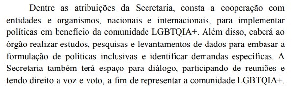 O texto da propositura prevê que a pasta tenha atuação direcionada à promoção de eventos, à realização de debates sobre questões relacionadas aos interesses dessa população, a nível nacional, além da fiscalização, acompanhamento, avaliação e controle das políticas governamentais relativas aos direitos de pessoas LGBTQIAPN+.