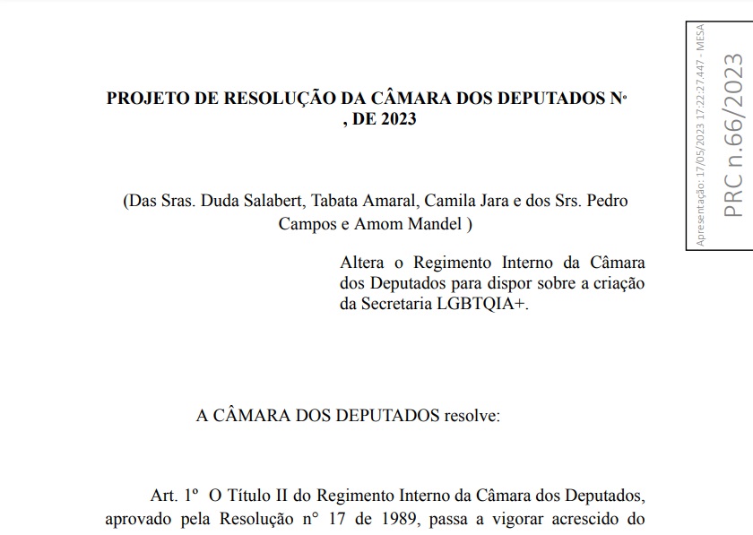 O deputado federal Amom Mandel (Cidadania-AM) apresentou um Projeto de Resolução da Câmara (PRC) que propõe a criação da Secretaria LGBTQIA+ (Lésbicas, Gays, Bissexuais, Transgêneros, Queer ou Questionadores, Intersexuais, Assexuais e outras identidades, incluídas em “+”) na Casa Legislativa. A proposta aguarda análise e parecer da Comissão de Constituição, Justiça e Cidadania (CCJ) da Câmara dos Deputados.