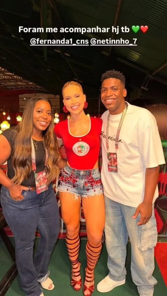 “Vieram me acompanhar hoje também”, escreveu a Rainha de Bateria ao posar ao lado da sogra, Fernanda Cristina, e do cunhado, José Oliveira Neto, de 17 anos.Como rainha de bateria da escola, Virginia escolheu um look em tons de vermelho — uma das cores tradicionais da Grande Rio — para compor o visual da noite. “Alô, @granderio. Hoje é dia de ensaio de quadra”, declarou a empresária ao compartilhar os registros do evento.