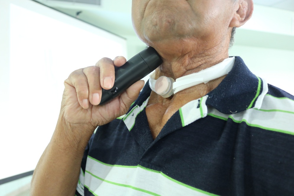“Os pacientes laringectomizados falam, porém não sai som. O aparelho, quando acionado, emite vibração, que é modulada na cavidade oral (língua, lábios e dentes), produzindo a fala”, explicou.