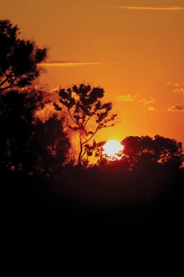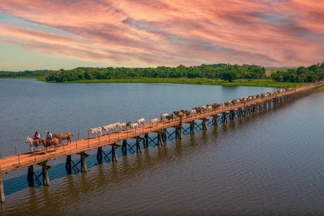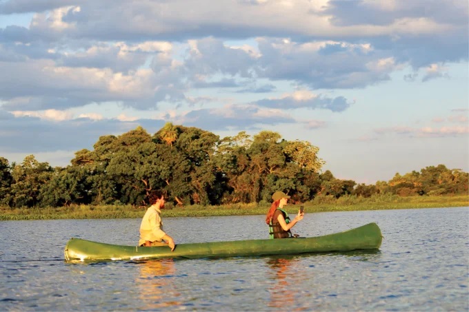Para aproveitá-lo, a nossa rotina era similar à dos peões. Acordávamos às 5h30 para fazer avistamentos das onças pintadas, passeios a cavalo e acompanhar o manejo do gado. Além de conhecermos uma infinidade de espécies de pássaros, entre eles o tuiuiú ou jaburu, tão popular na região que virou símbolo do lugar. Os caminhos eram percorridos ou por terra ou por água, remando canoas bem próximas aos jacarés. No fim da tarde, com os braços já cansados, o pôr-do-sol nos presenteava com um cenário abençoado. Era a compensação natural de uma jornada.