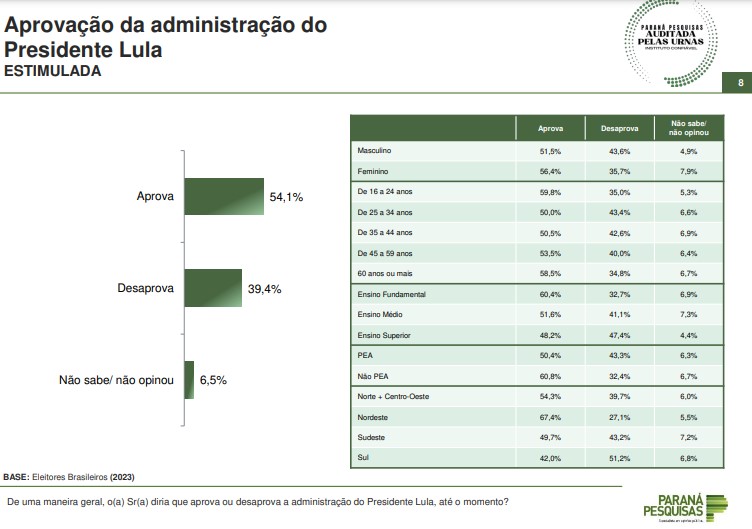Um novo levantamento da Paraná Pesquisas mostra a avaliação dos brasileiros frente a administração do Presidente Lula da Silva: 54,1% aprovam o Governo III do petista e 39,4% desaprovam.