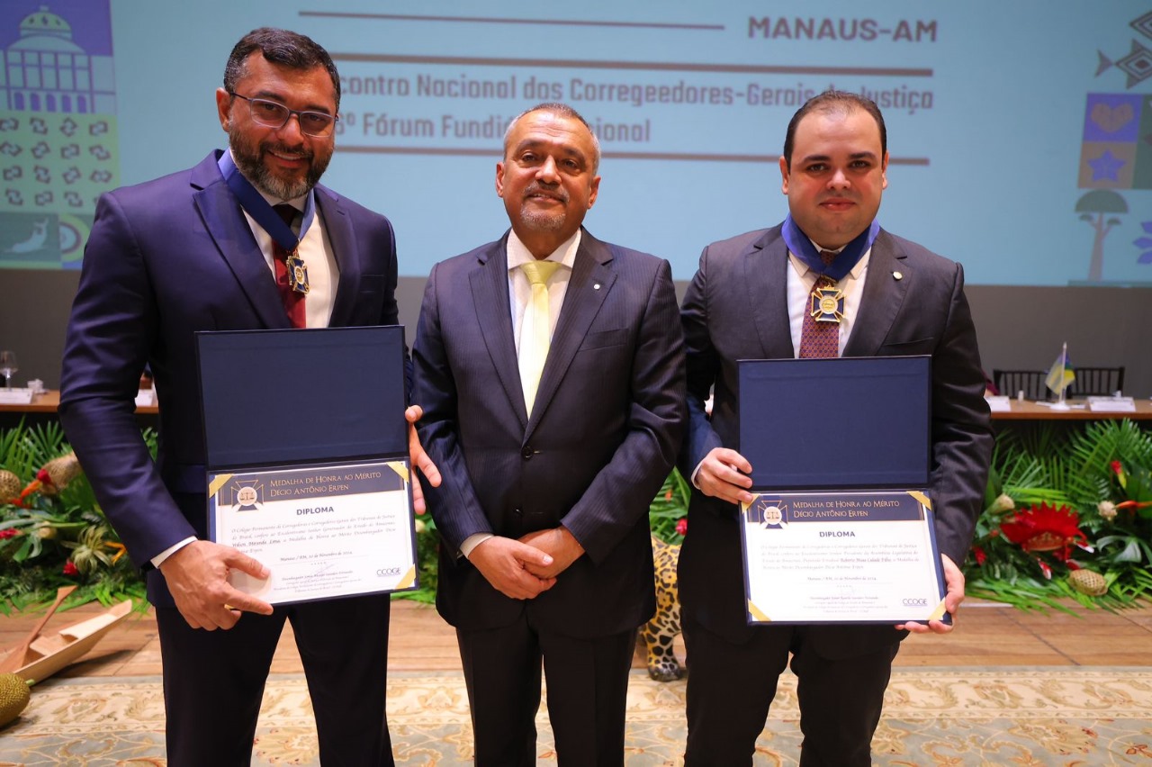 Durante o evento, o governador Wilson Lima também recebeu a medalha de Honra ao Mérito Desembargador Décio Erpen, entregue pelo Corregedor-Geral de Justiça do Amazonas, desembargador Jomar Fernandes, primeiro magistrado do Amazonas a presidir o Colégio Permanente de Corregedoras e Corregedores-Gerais dos Tribunais de Justiça do Brasil (CCOGE) e anfitrião dos eventos.