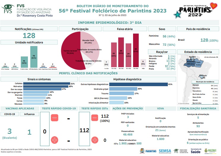 A Fundação de Vigilância em Saúde do Amazonas – Drª Rosemary Costa Pinto (FVS-RCP), vinculada à Secretaria de Estado de Saúde do Amazonas (SES-AM), divulga, nesta segunda-feira (03/07), o informe epidemiológico com o monitoramento da terceira noite do 56º Festival Folclórico de Parintins.