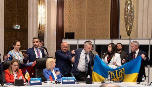 Nele, é possível ver Marikovski estendendo a bandeira azul e amarela do país atrás da líder da delegação da Rússia no evento, Olga Timofeeva, enquanto ela parece ser entrevistada. Ao se deparar com a cena, Valeri Stavitski, outro dos enviados russos à assembleia, arranca o emblema das mãos do ucraniano —que, por sua vez, vai atrás dele e recupera o item após socar Stavitski.