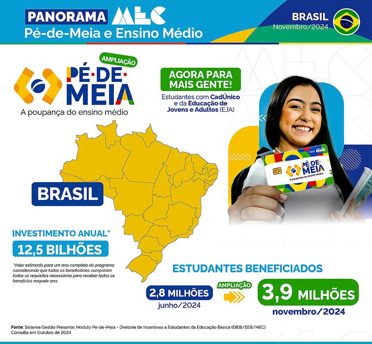 O Pé-de-Meia está beneficiando 3,95 milhões de estudantes em todo o Brasil. O total representa a inclusão de 1,1 milhão de estudantes, na comparação com os números de junho deste ano, após o programa ter sido ampliado para também beneficiar estudantes com Cadastro Único para Programas Sociais do Governo Federal (CadÚnico) e alunos da Educação de Jovens e Adultos (EJA). Antes da ampliação, a poupança do ensino médio chegava a 2,8 milhões de estudantes em todo o País.