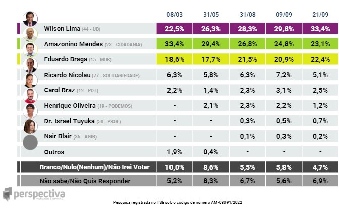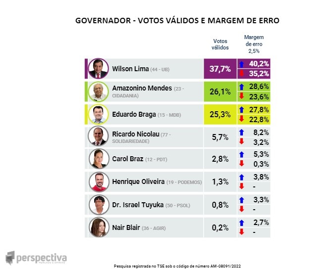 Segundo a pesquisa de intenção de votos, o governador e candidato a reeleição Wilson Lima (UB), segue na frente com 37,7% das intenções de votos, enquanto o segundo colocado Amazonino Mendes (Cidadania), segue com 26,1%.