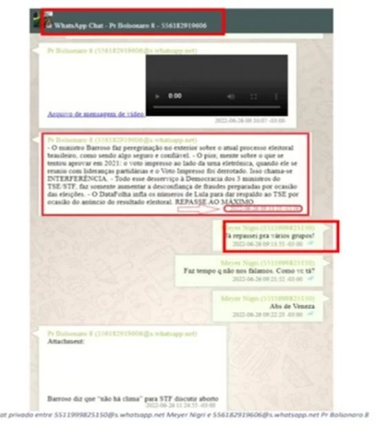 Mensagens recebidas deste número atribuído ao então presidente da República contêm ataques a integrantes do Supremo, informações falsas sobre urnas eletrônicas e orientação para repassar as mensagens “ao máximo”.