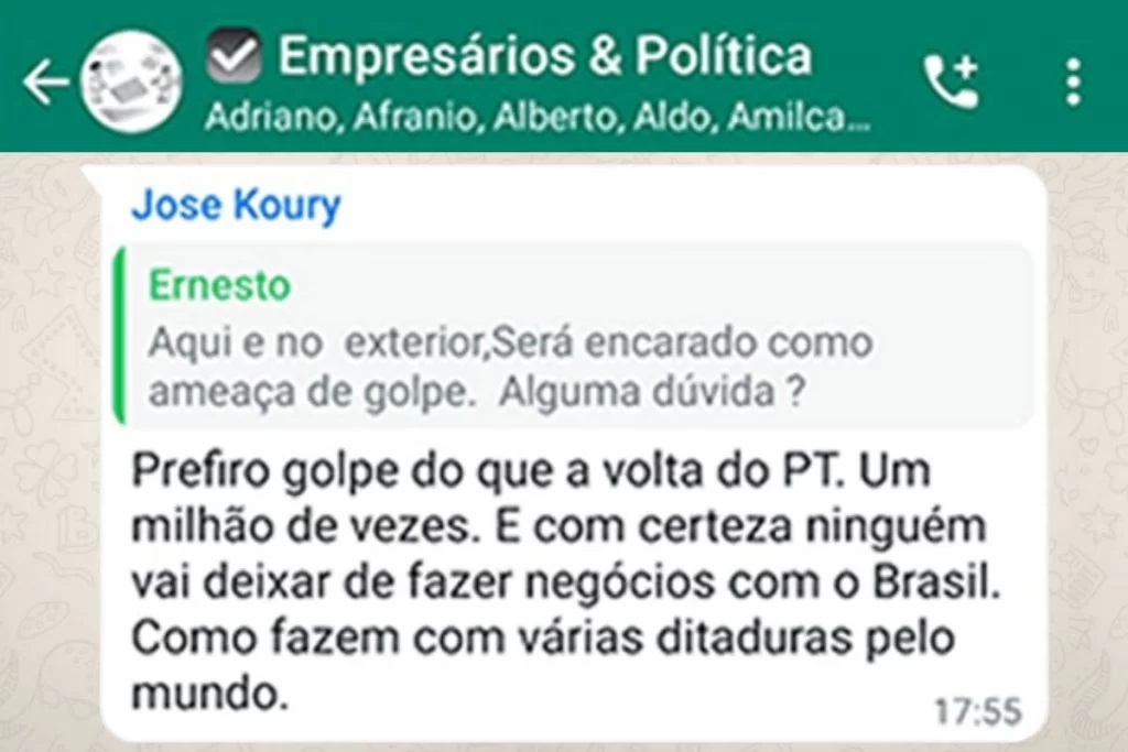 Em agosto do ano passado, a matéria “Empresários bolsonaristas defendem golpe de Estado caso Lula seja eleito” revelou um grupo de WhatsApp formado por grandes empresários brasileiros, apoiadores de Bolsonaro, que defendiam de forma explícita um golpe de Estado.