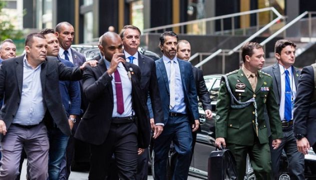 O presidente Jair Bolsonaro em viagem aos EUA; de farda verde, o tenente-coronel Mauro Cid.