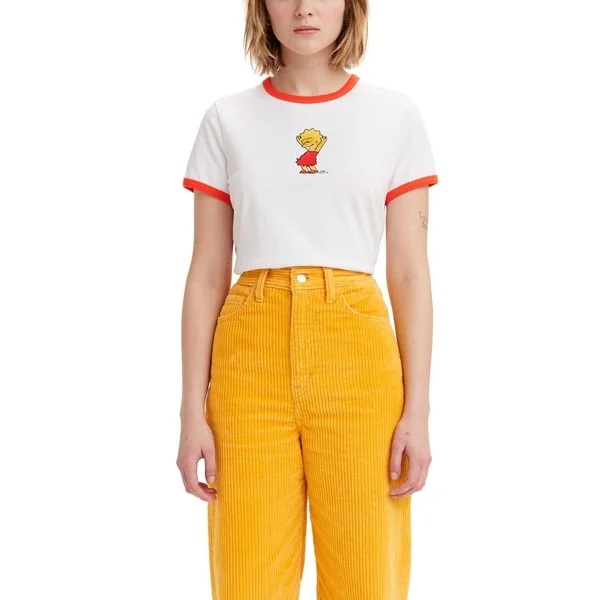 A t-shirt branca com a personagem Lisa Simpsons tem um corte e mangas e colarinho vermelho. Esse design faz referência direta aos uniformes escolares