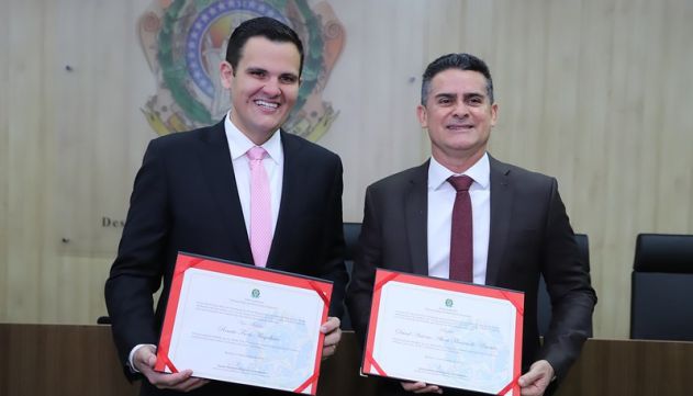 Na imagem, o prefeito reeleito, David Almeida, e o vice-prefeito eleito, Renato Junior com os diplomas recebidos do TREAM