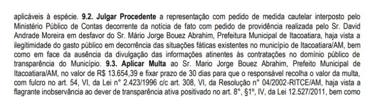 Ministério Público de Contas (MPC-AM) e aplicou multa de R$ 13,6 mil no prefeito de Itacoatiara, Mário Abrahim, por falta de transparência no uso de dinheiro público em contratações para a Expofest.