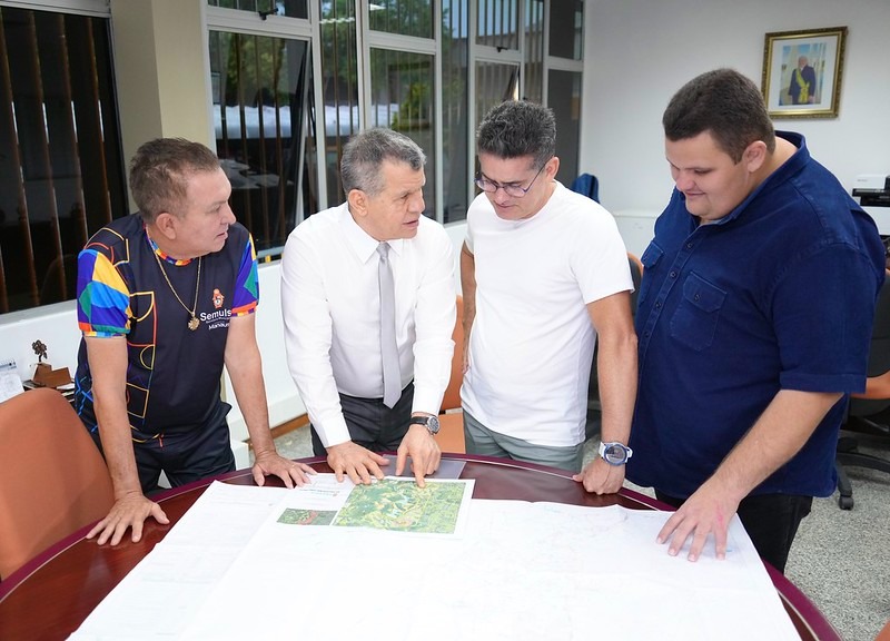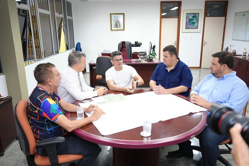 O prefeito de Manaus, David Almeida, acompanhado pelos titulares das secretarias municipais de Limpeza Urbana (Semulsp), Sabá Reis, e Infraestrutura (Seminf), Renato Júnior, se reuniu, na manhã desta terça-feira, 16/5, com o novo titular da Superintendência da Zona Franca de Manaus (Suframa), Bosco Saraiva, para discutir projetos que visam a regularização de áreas da Suframa que estão sendo ocupadas irregularmente, como a comunidade Coliseu, na Zona Sul.