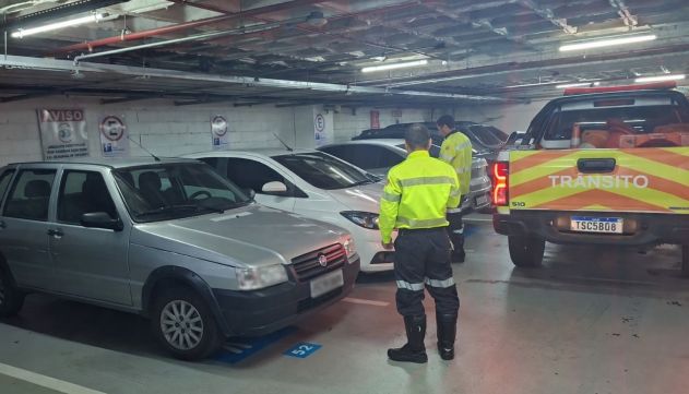 Agente de trânsito do IMMU fiscalizando vagas especiais em estacionamento de shopping