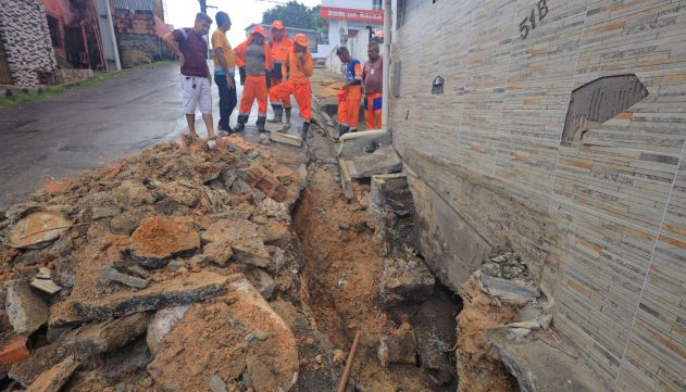 Equipe da Seminf realizando a recuperação de drenagem profunda na rua Francisco Couto Vale, no bairro Petrópolis