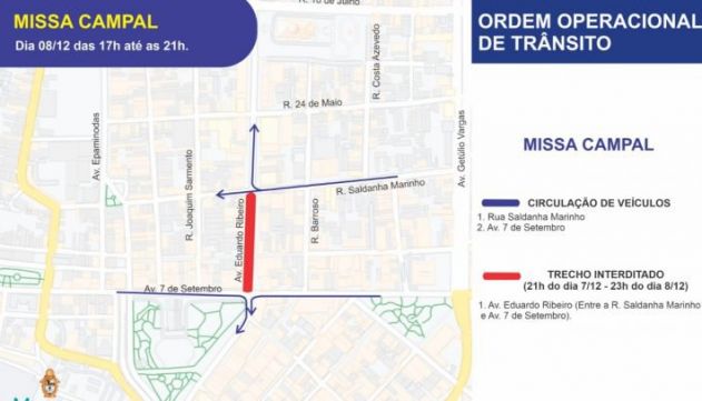 Os veículos que circularem em direção à avenida Eduardo Ribeiro, serão orientados a seguir para a avenida Floriano Peixoto. Os motoristas que estiverem transitando na rua Barroso, serão desviados para outros itinerários.