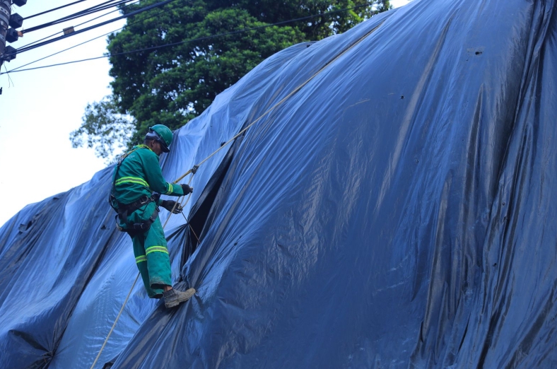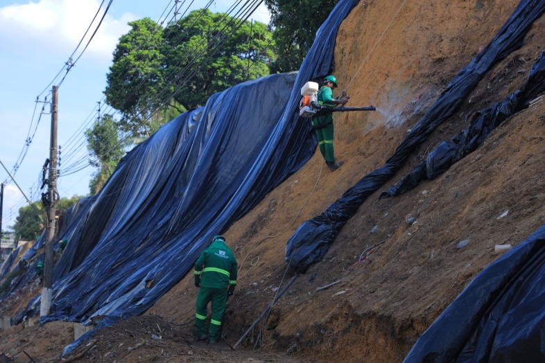 Antes da aplicação da manta, foi realizada a limpeza completa da área com apoio da Secretaria Municipal de Limpeza Urbana (Semulsp), incluindo a retirada da vegetação e de resíduos que comprometiam o barranco. Em seguida, a Seminf procedeu com a preparação do solo, limpeza dos detritos e aplicação do polímero que impermeabiliza o talude, garantindo as condições adequadas para receber a geomanta e, posteriormente, o jateamento de argamassa, etapa que sela e compacta toda a base.