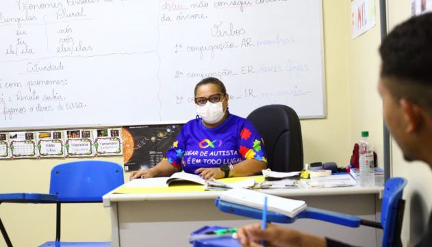 Sala de aula com professora e aluno (perfil), no complexo Pop