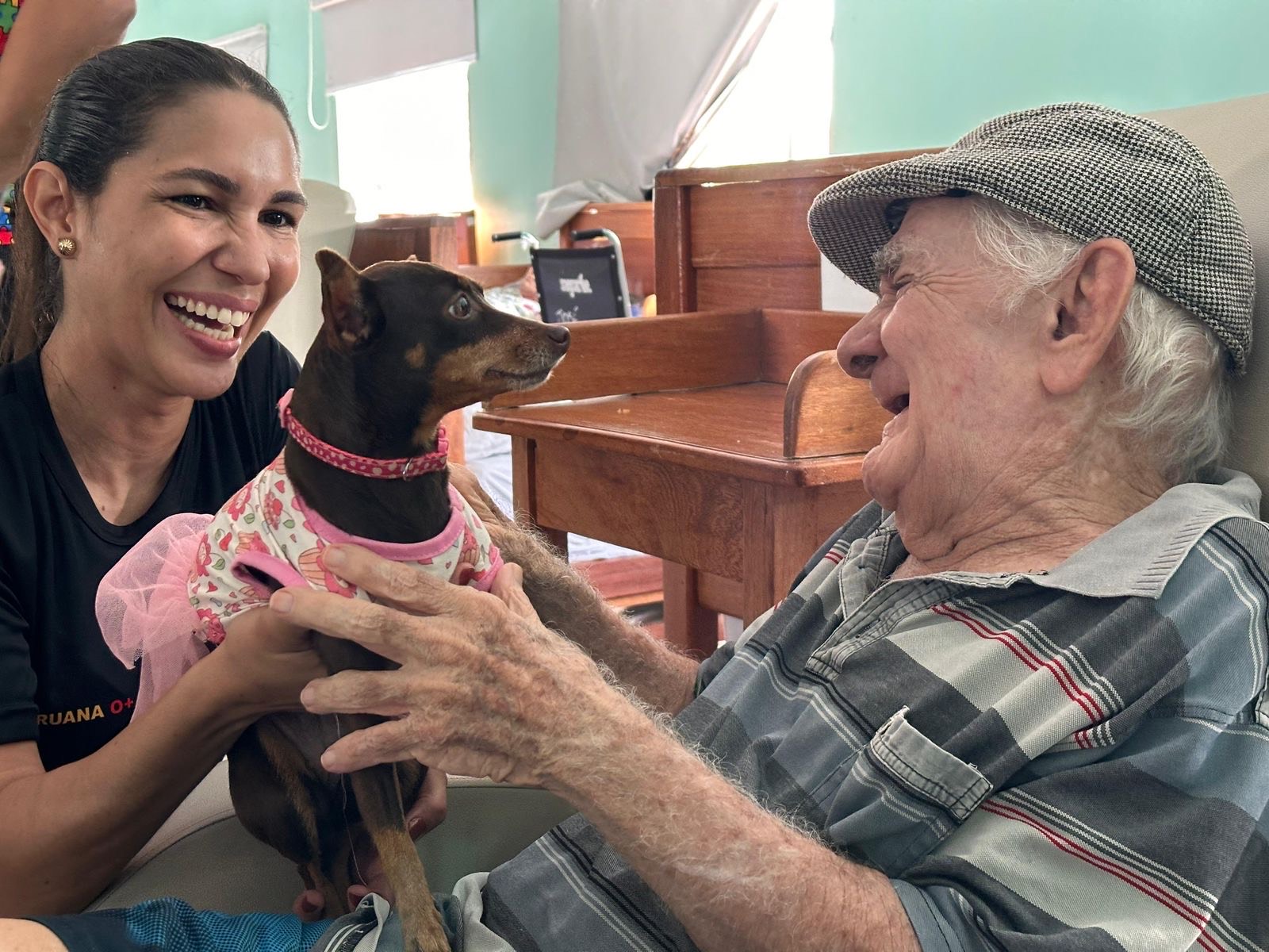 Entre os protagonistas da visita estavam o "Caju", da raça border collie, e "Morena" e "Jaca", pinschers, que circularam pelos espaços da instituição, brincando, recebendo carinho e despertando sorrisos. A interação encantou os idosos e reforçou os efeitos positivos da “Pet Terapia” no bem-estar emocional e social.