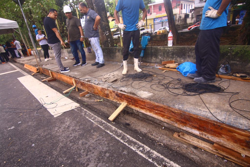 Aqui nós faremos a reconstrução do calçamento, faremos uma calçada nova, uma mureta que servirá de guarda-corpo e, a pedido da comunidade do bairro do Coroado, um corrimão, também, para que tire esse tom da grade, que está velha. Segundo os moradores, há mais de 20 anos essa localidade não recebe nenhum tipo de trabalho por aqui.