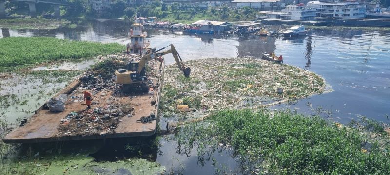 operação, realizada diariamente, concentra esforços na retirada de resíduos que chegam ao rio pelas saídas dos igarapés nos limites da cidade