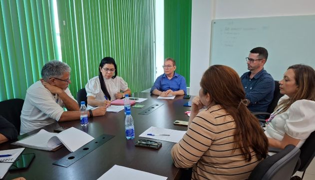 Diretor-presidente do IMMU, Arnaldo Flores, acompanhado de representantes do setor de Transporte do IMMU e do Sinetram, durante reunião de alinhamento para o lançamento do ?Programa Escola de Transporte?