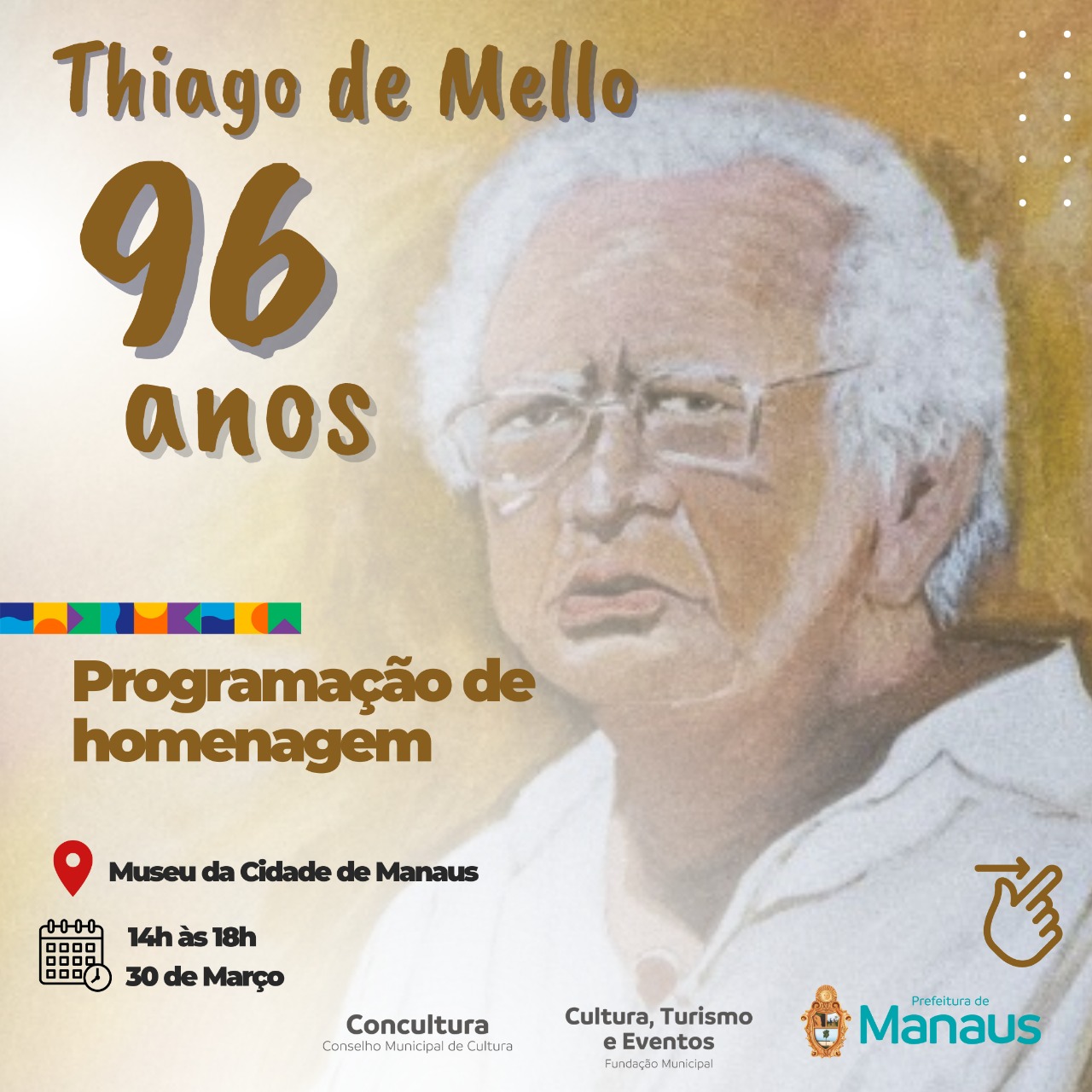 Para comemorar o aniversário de nascimento de 96 anos do poeta Thiago de Mello, a Prefeitura de Manaus realizou uma programação especial no Museu da Cidade de Manaus, praça Dom Pedro II, uma tarde de palestras e sarau literomusical, por meio do Conselho Municipal de Cultura (Concultura) e Fundação Municipal de Cultura, Turismo e Eventos (Manauscult), com o apoio da Secretaria Municipal de Comunicação.