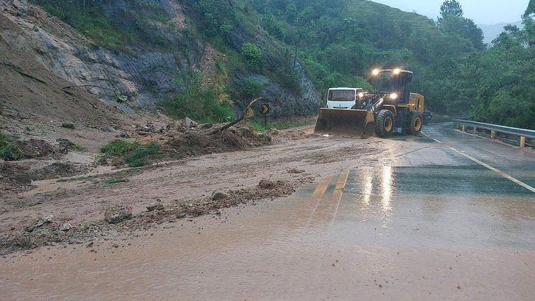 Trator da prefeitura de São Sebastião tira entulhos em uma rodovia do município